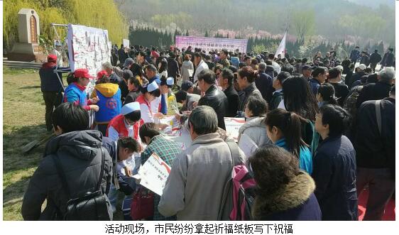 ? 本次祈福活動分別在福壽園遺體(器官、角膜)捐獻紀念廣場、綠地中心舉行。福壽園遺體(器官、角膜)捐獻紀念廣場祈福活動中,大家向遺體捐獻者和器官角膜捐獻者默哀,省市紅十字會、駐濟各遺體接受單位、器官移植醫院和組織庫的負責人向捐獻紀念碑敬獻花籃。隨后來賓及志愿者為遺體器官角膜捐獻者集體祈福,家屬點燃祈福蠟燭并敬獻鮮花,紛紛在心愿墻的卡片上留下對自己親人深深的緬懷。山東省眼科醫院高華副院長向紀念碑敬獻了花籃與鮮花,并帶領山東省紅十字眼庫工作人員與山東省眼科醫院志愿者代表,引導市民填寫祈福紙板。