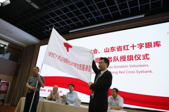 濟南市紅十字會孫寶占副會長向山東省眼科醫院志愿服務隊授旗