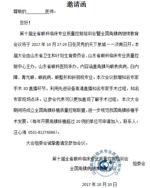第十屆全國角膜病繼教會暨山東省眼科臨床專業質控會邀請函