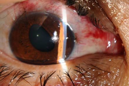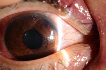 圖1 右眼繼發性青光眼,12:00-3:00位虹膜根部離斷。