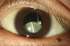 ?眼部查體:雙眼晶體混濁,左眼晶體脫位。???