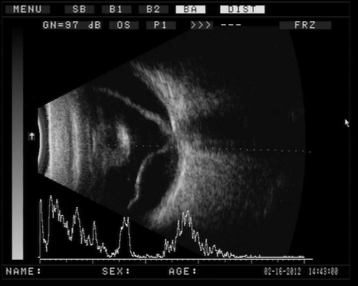 B超提示:玻璃體混濁(雙眼)?高度近視、后鞏膜葡萄腫(右眼)?視網膜脫離(左眼)。??