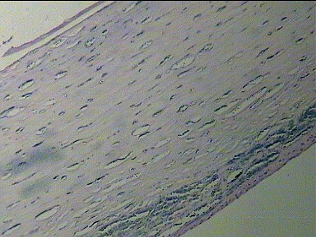 組織病理學變化:角膜上皮厚薄不均。前彈力膜部分破壞、斷裂或分裂成數層。實質板層擺列較疏松。在實質纖維之間有甚多大小不等的柳葉狀或梭形空隙。部分角膜實質細胞胞質豐富而核固縮。后彈力膜普遍增厚呈板層狀,或呈滴狀突伸向前房。內皮細胞數目減少,部分壞死,胞膜破裂,胞核固縮。病變物質分布在上皮下前彈力膜前后的空泡細胞、角膜實質細胞及內皮細胞的胞質內外及實質層空隙內。此種物質在HE染色片中呈嗜堿性淡藍灰色,PAS染色僅淡紫紅色,剛果紅及Masson三色不著色。唯有膠性鐵染色呈非常醒目的鮮藍色。此種染色是病理鑒別斑塊狀營養不良的最重要方法。(圖1-1、1-2)