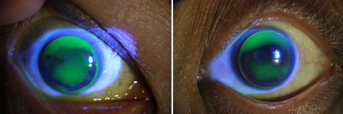 雙眼靜態配適:上方綠色熒光填充偏多與上面角膜地形圖上方曲率偏大相對應。周邊淚新月寬度可以接受。總體靜態配適狀態良好。