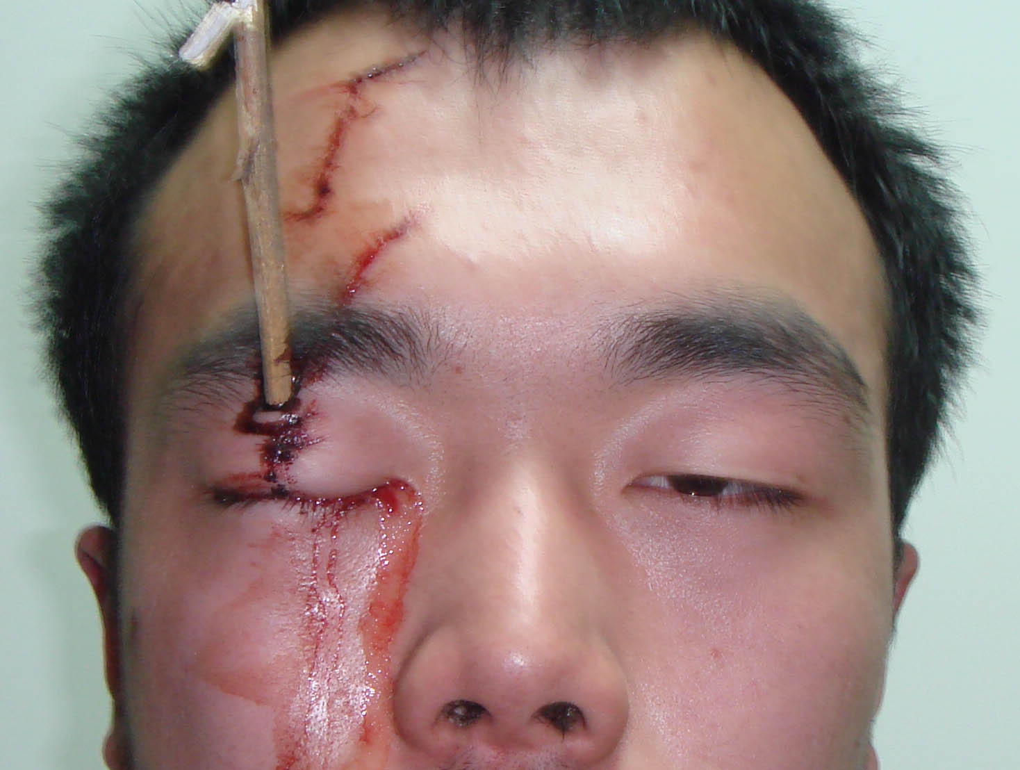 2012年2月9日晚八點,一輛救護車在警車的帶領下開進醫院的大門。送進醫院的是一名22歲的男性青年, 3小時前患者登泰山時不慎滑倒摔傷右眼,當地醫院檢查后因病情較重轉來我院進一步診治。眼部查體:一根直徑約5mm的樹枝從右側眉弓下緣刺入眼眶,一直向下延伸到右側口角上方,眼瞼高度腫脹,視力無法檢查。單憑第一印象,考慮眼球極有可能被整體刺穿,傷情非常嚴重,嚴重時可能眼球都難以保留。醫院迅速組織相關科室醫生進行會診,給予局部消毒后立即行雙眼眶CT檢查。