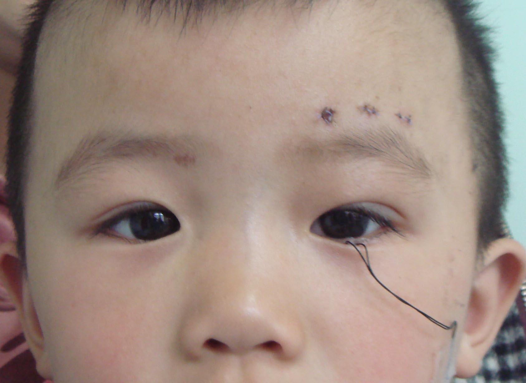 病例1: 患兒男,2.5歲,左眼先天性上瞼下垂。麻醉方式:全身麻醉。手術方式:闊筋膜懸吊上瞼下垂矯正術。