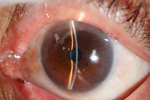 本病的臨床癥狀通常較嚴重,治療較困難,且易復發。患者自覺癥狀常有眼磨、異物感、畏光、流淚等。瞬目時上述癥狀加重,而閉眼時癥狀則可以減輕。絲狀物的長度從0.5mm到數毫米不等,可被孟加拉紅染成紅色。絲狀物與角膜的黏附通常較牢固,附著處角膜下方可出現小的灰白色上皮下混濁。由于瞬目動作,絲狀物可能會彎曲折疊,用力閉眼動作可能使絲狀物從角膜表面脫落而殘留角膜上皮缺損區,此缺損區又可重新形成新的絲狀物,絲狀物還可在不同位置反復出現。