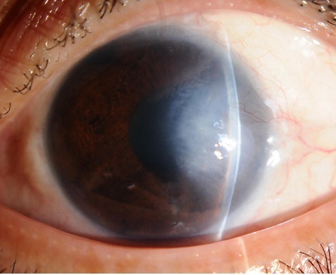 ??? 因此,對于短眼軸淺前房的患者要慎重選擇青光眼閥植入手術,避免引起角膜的并發癥。下圖顯示了青光眼閥硅管與角膜接觸導致角膜病變。
