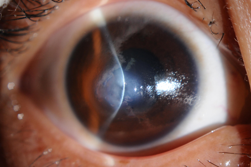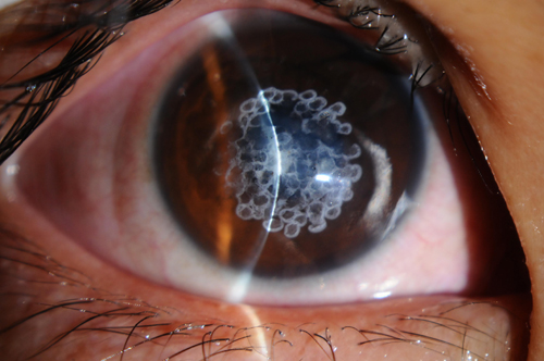 圓錐角膜是以角膜擴張、中央變薄向前突出,呈圓錐形為特征的一種眼病(圖d);它常造成高度不規則近視散光。部分患者形成角膜急性水腫、形成瘢痕,視力顯著下降。 多于青春期發病,緩慢發展,像小趙這樣突然急性發作的病例比較少見,如發現自己出現上述癥狀出現需立即去醫院就診,根據病情行相應的治療。