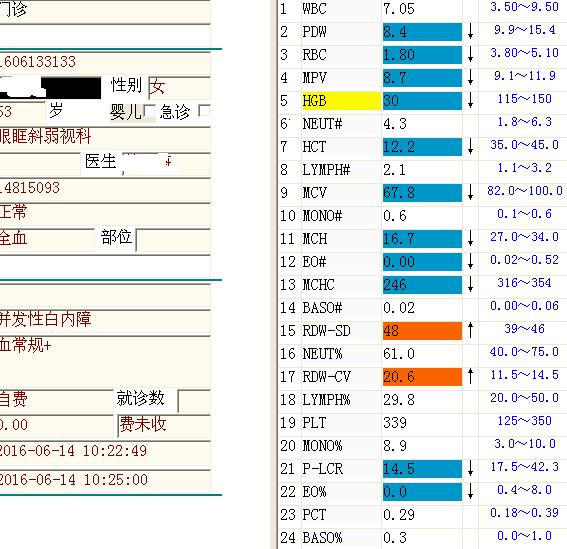 ????血紅蛋白減少是引起貧血的主要原因,這份報告單中血紅蛋白量比參考值少30點左右,高度懷疑是貧血。