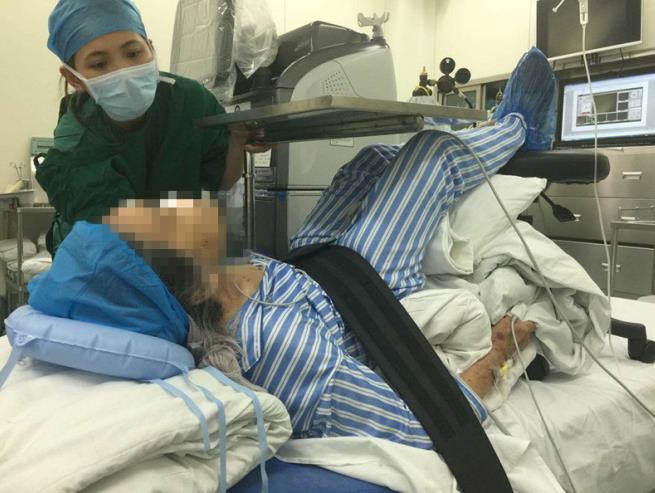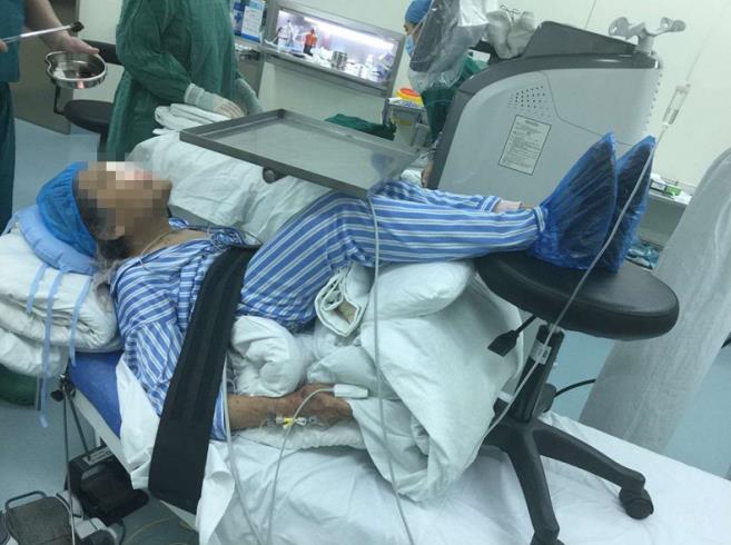 ?此時,老人肩部支撐在床上,兩只手緊緊握住凳子的腳,努力保持最好的姿勢以進行手術。為了確保雙腿不滑落下來,手術室特意安排了護士扶著老人的雙腿。“老人家,你能支撐得住嗎?不行就告訴我們。”手術現場,醫生問道。“我能堅持,就是委屈你們了。”老人說。