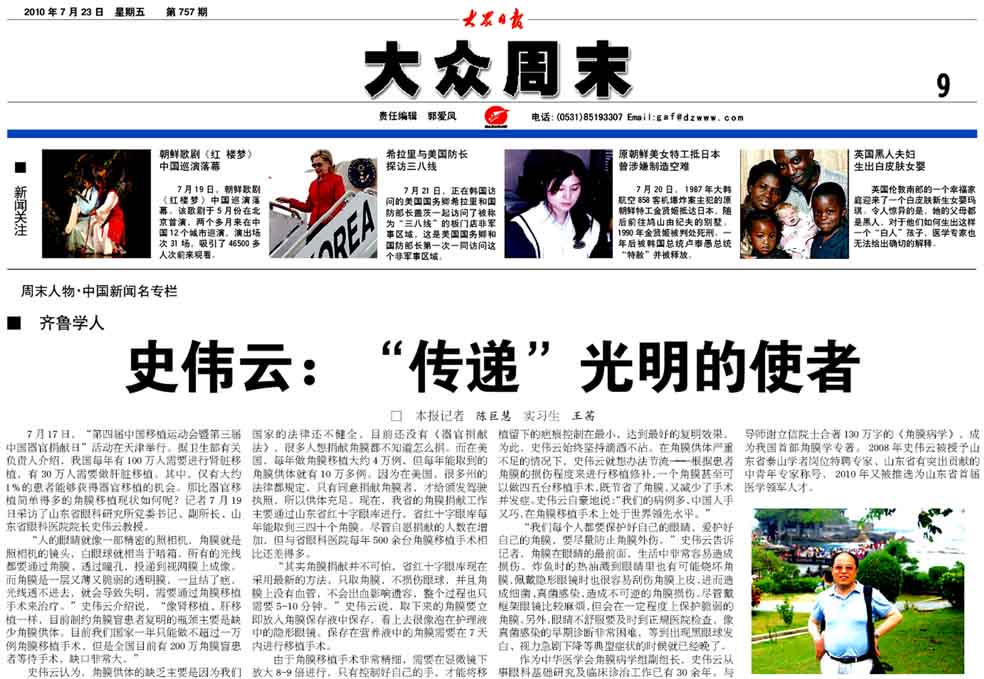 作為中華醫學會角膜病學組副組長,史偉云從事眼科基礎研究及臨床診治工作已有30 余年,與導師謝立信院士合著130萬字的《角膜病學》,成為我國首部角膜學專著。2008 年史偉云被授予山東省泰山學者崗位特聘專家、山東省有突出貢獻的中青年專家稱號,2010 年又被推選為山東省首屆醫學領軍人才。