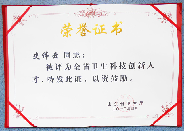 2011年5月30日,全省衛生科教外事工作會議在濟南舉行,省衛生廳、教育廳、科技廳領導出席大會。省衛生廳廳長、黨組書記劉奇及副廳長仇冰玉分別作重要講話。大會對全省衛生科技創新人才及全省基層衛生人員培訓工作先進集體和先進個人進行了表彰,我院院長史偉云教授因在全省衛生科技創新工作中的突出貢獻被授予“全省衛生科技創新人才”榮譽稱號。