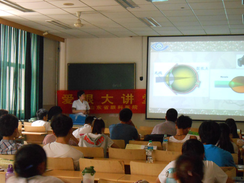 ????6月6日上午9點聯合濟南大學化工學院舉行“愛眼大講堂,共享光明世界”活動。我院眼科專家劉明娜主任親自為大學生們進行了有關準分子近視手術方面的講座,配鏡中心的志愿者們設立專門服務臺為大學生們現場提供維修清洗眼鏡的服務,并向他們贈送了視力表和眼鏡布。??