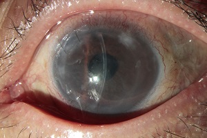 圖一: 角膜內皮細胞功能失代償患者,術前眼磨、眼痛,視力下降,術前視力0.02;