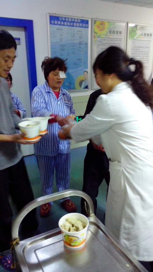 ?冬去春來年復年,花開花謝迎馬年。2014年1月30日是農歷大年三十,中國傳統的新年佳節,是中國人在外奔波忙碌了一年后回家團聚的日子。在這樣一個特殊的日子里,山東省眼科醫院的部分患者因為病情原因不能回家,只能在醫院度過春節。為使患者朋友不感到孤獨、落寞,我院特地為仍在住院治療的患者和家屬免費提供水餃、糖、水果、干果等年貨,值班的醫護人員與患者朋友一起吃年夜飯,一起看春晚,一起歡樂,就像一家人般其樂融融,營造了溫馨祥和的氛圍,使得這個年過的有年味,讓患者及家屬感受到了家的溫暖。
