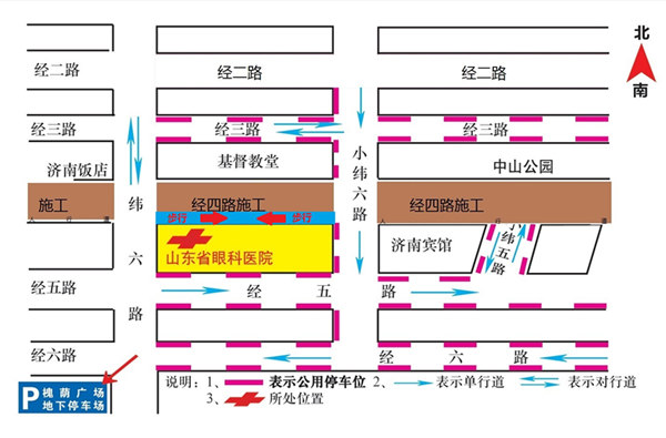 由于近期醫院門前經四路于2015年7月19日至2015年10月19日進行市政施工,影響了廣大患者的出行。屆時,經四路將無法通行,同時,相關公交線路進行了對應調整。施工期間,山東省眼科醫院照常工作,患者的診療、手術不受影響。為了方便患者朋友乘車及停車,節約路途時間,醫院將最新公交車乘車線路及停車位示意圖整理如下,請廣大患者提前熟知: