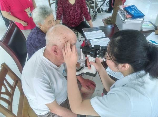 山東省眼科醫院義診分隊根據老年人大都乘坐輪椅,行動不便的客觀情況,調整了原來的義診布局,縮短各個義診項目之間的距離,讓老人可以在最短的時間內完成全部義診項目。因為年齡的原因,老人們大都患有不同程度的眼疾,以白內障為主。山東省眼科醫院的的孫吉君醫師詳細的向老年人解釋了白內障形成的原因和現在主流的治療方式。在義診現場,義診隊員發現被稱為“民國以來第一位抗日烈士”蔡公時的女兒蔡今明老人也在此療養,孫吉君醫師詳細的為蔡今明老人做了檢查,蔡今明老人精神矍鑠,不斷對山東省眼科醫院的醫護人員表示感謝。還有失去左臂但是不向命運妥協,87歲高齡仍堅持每天畫國畫的薛世武老人,薛世武老人的慈祥和樂觀深深的打動了在場的醫務人員。