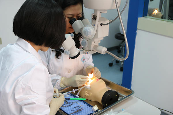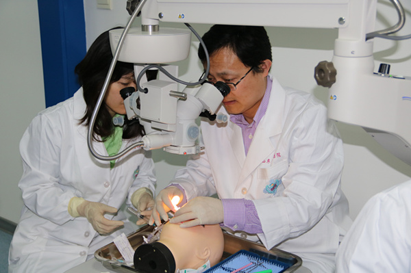 ??? 此次培訓作為我國首個角膜移植手術醫師培訓基地的第三次培訓班,凝聚了教授團隊的心血與汗水。在理論學習過程中,采用集中授課、分組討論的方式,由專家指導小組對角膜移植相關理論知識、手術技能進行詳細講解,并向學員展示了相關手術錄像。在臨床實踐技能培訓過程中,采用人工前房聯合豬角膜模擬人眼角膜模型,高清手術顯微鏡下同步示教訓練的方式,本次培訓以常規部分板層角膜移植培訓為主,每人可完成5-8例角膜移植操作。
