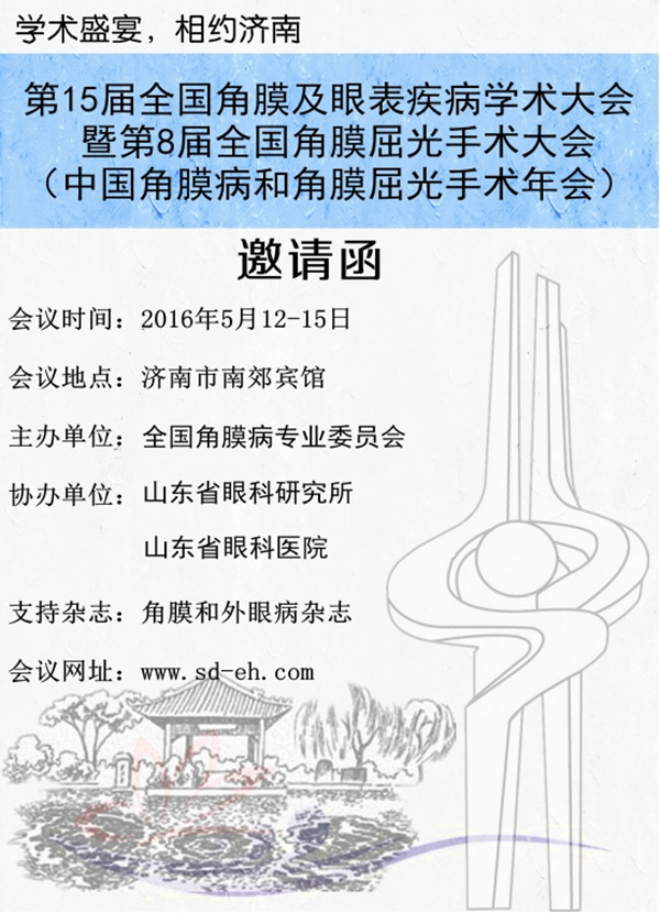 您好!全國角膜病專業委員會定于2016年5月12-15日在中國濟南召開第15屆全國角膜及眼表疾病學術大會暨第8屆全國角膜屈光手術大會。本次大會以“嚴謹、求精、高質量、持續發展”為宗旨,大會名譽主席謝立信院士,大會主席史偉云教授,副主席劉祖國教授、徐建江教授、孫旭光教授、李瑩教授,大會秘書長高華教授,誠摯歡迎您的到來!