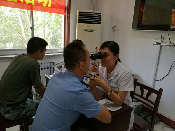 山東省眼科醫院李娜醫師為空軍駐地官兵進行裂隙燈檢查