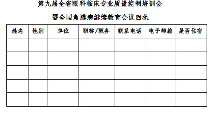 附:《第九屆全省眼科臨床專業質量控制培訓會暨全國角膜病繼續教育會議回執》